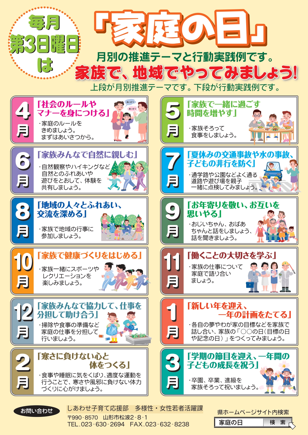 「山形県こども・子育て基本条例」では、毎月第3日曜日を「家庭の日」として、家族の語らいや親子の触れ合いを通して、子どもを育む家庭の素晴らしさや家庭の大切さを見つめ直す運動を進めています。
